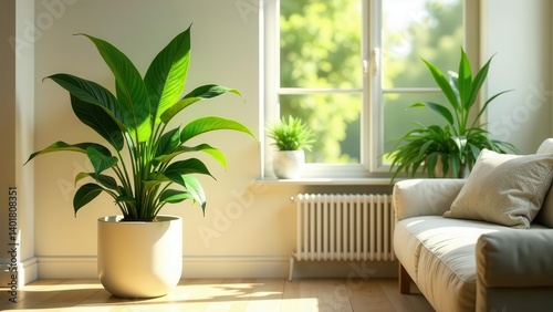 Sunlight illuminates a tranquil living space, featuring a large potted plant and a cozy beige sofa, creating a serene and inviting atmosphere.