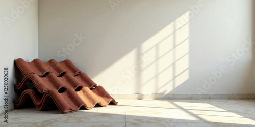 Sunlight illuminates terracotta roof tiles stacked in a corner of a minimalist room