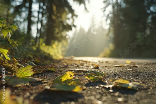 Sunlit Asphalt Road Covered in Fallen Leaves Through a Dense Forest with Mist and Sunlight Creating a Serene Atmosphere for Autumnal Landscape Photography