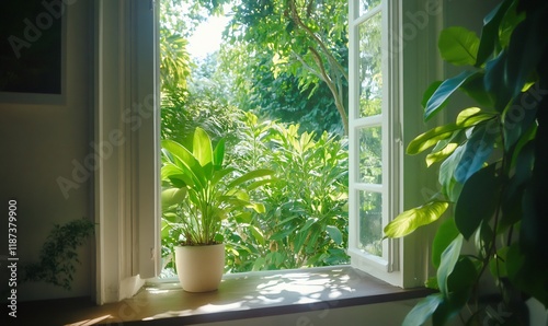 Sunlit window, potted plant, lush garden view, home interior, peaceful scene