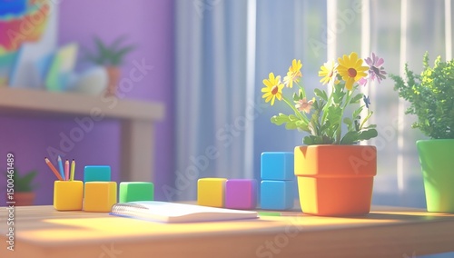 Sunny Childs Desk with Playful Blocks.