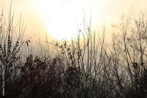 Sunrise illuminating silhouettes of plants in a peaceful landscape