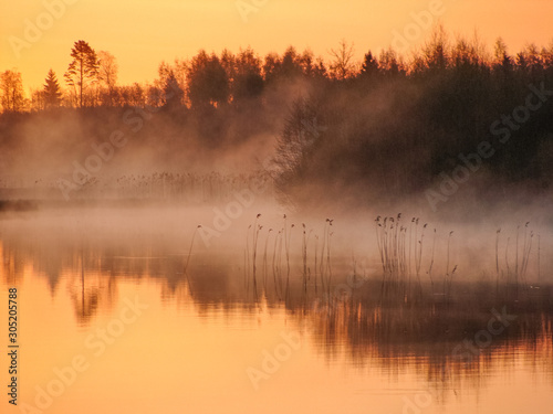 Sunrise landscape at the water, trees reflection in the lake on foggy morning, early morning reeds mist fog and water surface on the lake