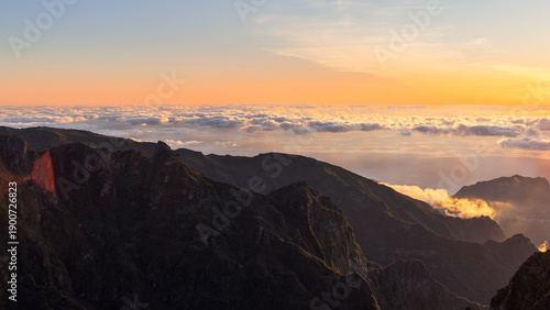 Sunrise over cloud sea and dramatic mountain ridge at Pico do Arieiro Madeira Portugal, golden dawn light lifts rugged peaks above glowing clouds near the Atlantic horizon