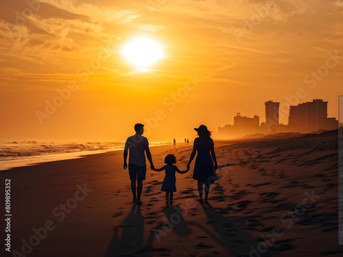 Sunrise Stroll: Family Silhouettes Enjoy a Morning Beach Walk. Family Walks Hand-in-Hand Towards the Rising Sun. generative AI