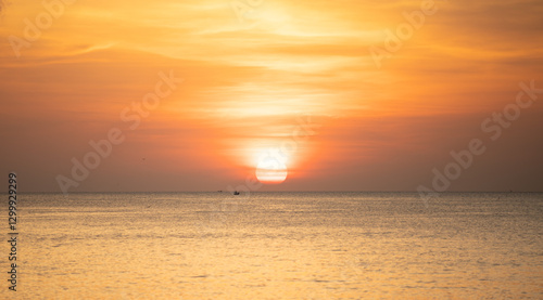 Sunset over calm ocean reflecting warm orange hues with distant boat silhouette near shore in evening light