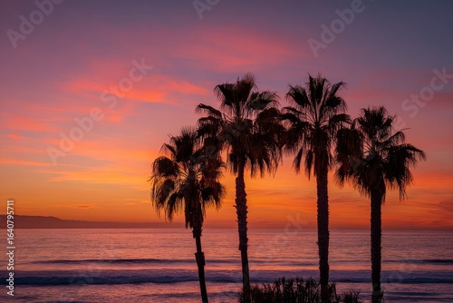 Sunset Over Ocean with Silhouette of Palm Trees at Dusk