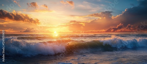 Sunset over waves with vibrant orange and blue hues, clouds scattered across the sky, creating a tranquil beach scene at the horizon.