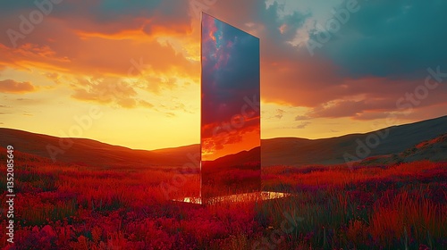 Sunset reflected in a tall, mirror-like monolith standing in a red field.