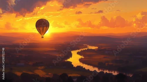 sunset, silhouetted against the sky warm gradient. Below, rolling fields and rivers stretch toward the horizon in golden light.