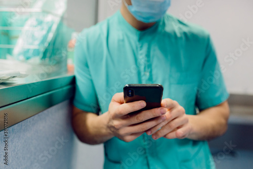 Surgeon holding a phone at the hospital