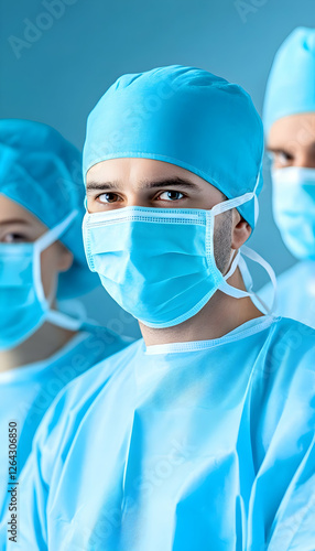 Surgeons wearing masks & scrubs in hospital; focus on male in front; staff behind generative AI