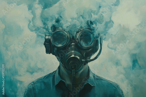 Surreal depiction of a figure wearing a gas mask surrounded by blue smoke in a mysterious environment