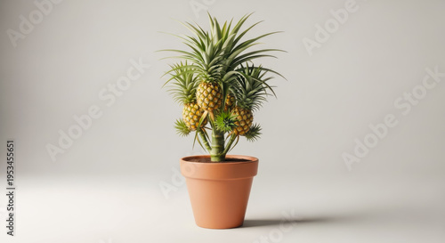 surreal miniature pineapple tree with multiple small pineapples growing in a terracotta pot on a white background