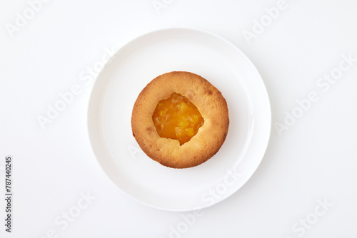 Sweet bakery at a round plate isolated at white background. Pastry image. Jam topping