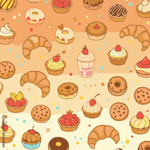 Sweet treats pattern with various pastries in a colorful, whimsical design. Assorted baked goods displayed on a pastel orange background with scattered confetti-like sprinkles.