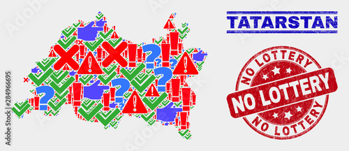 Symbolic Mosaic Tatarstan map and seal stamps. Red round No Lottery grunge seal. Bright Tatarstan map mosaic of different randomized elements. Vector abstract collage.
