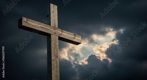 Symbolic religious suffering depicted on a rough wooden cross against a dramatic sky, representing ultimate sacrifice and Christian faith, history, theology, spirituality