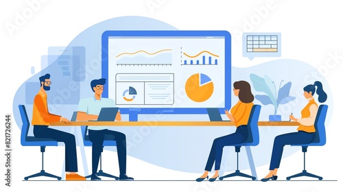 Team collaboration in a modern office with data analytics on the screen, showcasing teamwork, brainstorming, and discussion on growth charts.