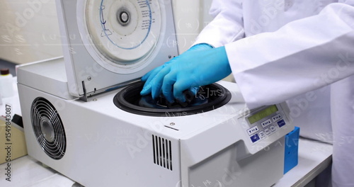 Technician wearing white lab coat loading sample tubes into benchtop centrifuge at lab bench