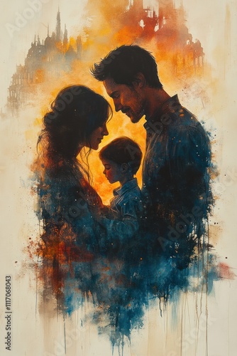 Tender Family Portrait in Watercolor Style Mother Father Child Love Light