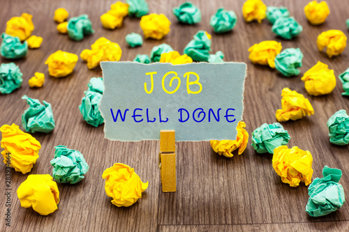 Text sign showing Job Well Done. Conceptual photo Well Performed You did it Cheers Approval Par Accomplished Clothespin holding gray note paper crumpled papers several tries mistakes
