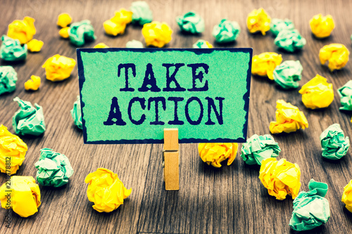 Text sign showing Take Action. Conceptual photo advices someone to do something or reaction right now Clothespin holding green note paper crumpled papers several tries mistakes.