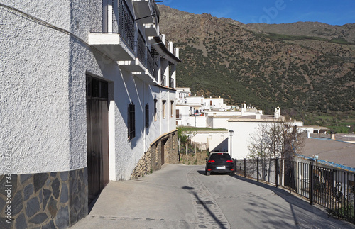 The black car and white stone small houses on the empty street of the mountain village in Europe on the sunny day