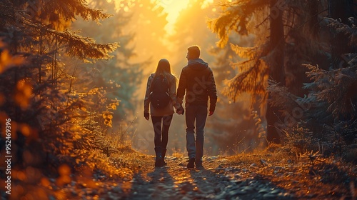 The couple walking together on a tranquil forest trail, hand in hand, surrounded by the beauty of tall trees and the soft, dappled sunlight,