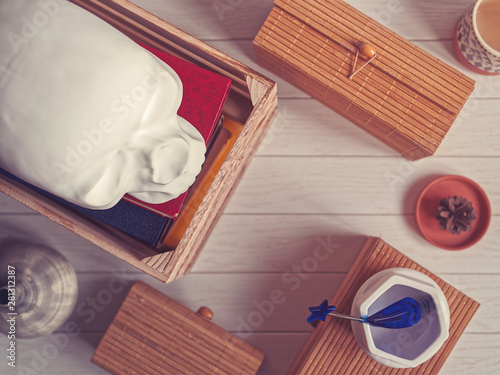 The decorative figure in the form of a human skull is on top of the books in a wooden box. Nearby are wooden boxes and other items. White wooden background. Top view.