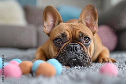 The French Bulldog lays patiently on a plush rug, its big eyes focused on a selection of colorful toys scattered nearby, showcasing a calm moment in a cozy indoor setting