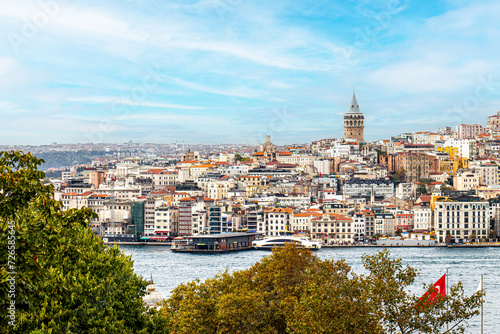 The Galata Tower looms over the dense, colorful buildings of Istanbul's skyline, with the bustling Bosphorus in the foreground, encapsulating the city's vibrant urban life.