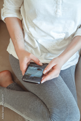 The girl lies on a sofa with a phone in his hand. Online shopping concept