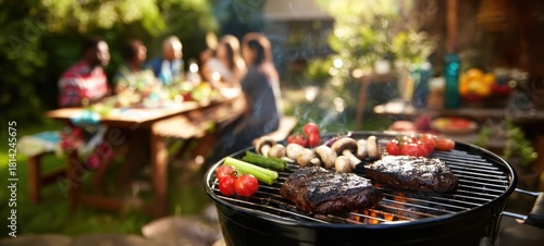 The Grill with Juicy Steaks and Vegetables at a Backyard Summer Gathering