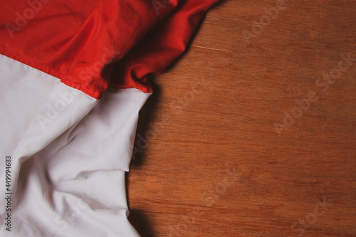 The Indonesian flag is red and white with a wooden table background.