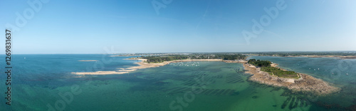 The panorama of the cove of Trehennarvour in Saint-Philibert in Europe, France, Brittany, Morbihan, Saint Philibert, in summer, on a sunny day.