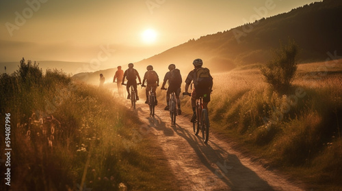 The Path to Adventure, Cyclists on a Sunset Road - Back View Generative AI