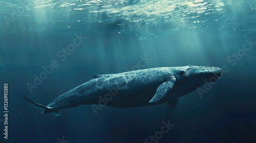 The picture of the blue whale is swimming in the ocean with the bright light of the sun, blue whale is the largest mammal animal known to have ever existed, both in terms of length and weight. AIG51.