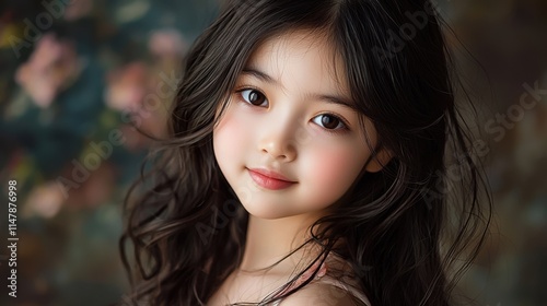 The portrait captures a young Asian girl with flawless porcelain skin, deep almond shaped eyes, and a gentle smile that lights up her face