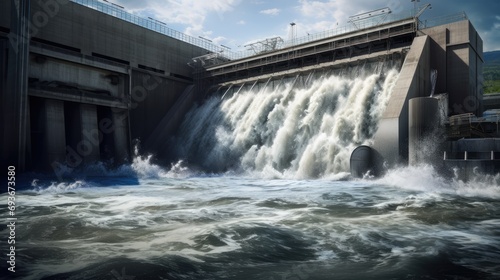 the power of nature and energy production showcasing water discharge at a hydropower plant, emphasizes the force and fluidity of water in motion.