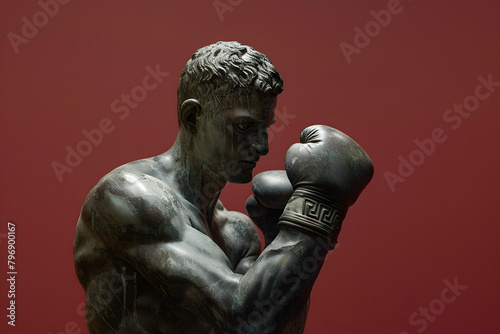 The sculpture of a boxer in the Greek Hellenistic style, fists wrapped in himantes, set against a combat ready deep red background, capturing the raw essence of Olympic boxing