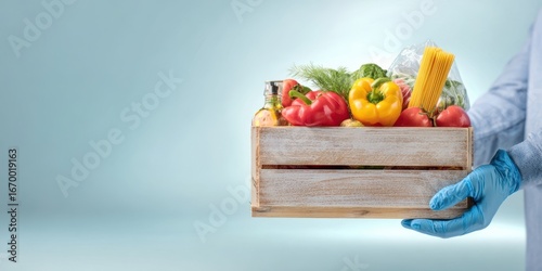 The wooden crate of fresh colorful vegetables held by a gloved delivery worker