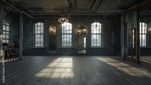 There is an empty room featuring a great number of windows and mirrors