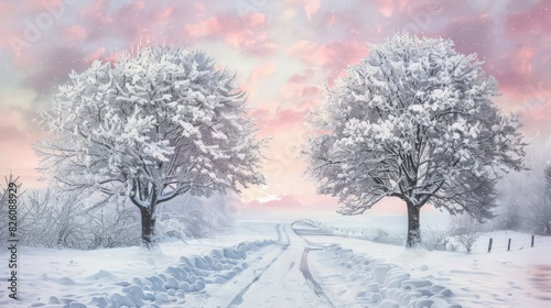 This peaceful winter scene showcases two snow-covered trees against a backdrop of a pink sky, with a path leading gently through the pristine snow.