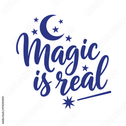 This vector illustration shows the inscription magic is real written in a modern font with a moon, stars, and magic wand.