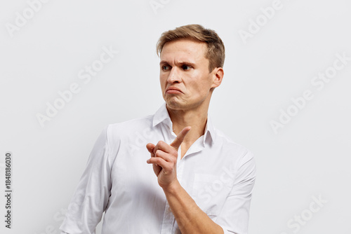 Thoughtful young man in white dress shirt displaying skepticism or doubt against plain light background. Studio portrait emphasizing facial expression and body language. People concept, emotion, doubt