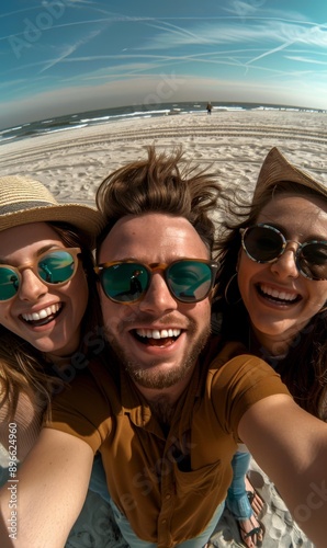 Three friends wearing sunglasses smile and pose for a selfie on the beach. AI.