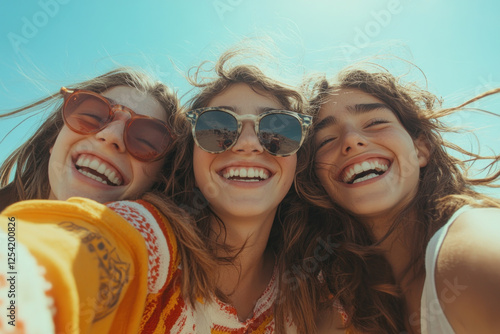 Three girls smiling and taking a selfie in a bright sunny park.