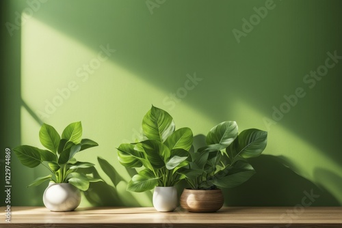 Three green plants in white and wooden pots on a wooden table with sunlight on a green wall, AI generated