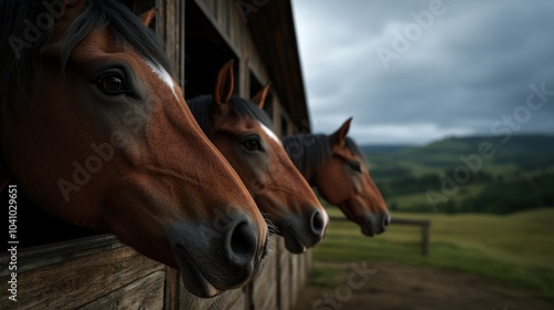 Three Horses Looking Out of Stable Stalls in Rural Landscape